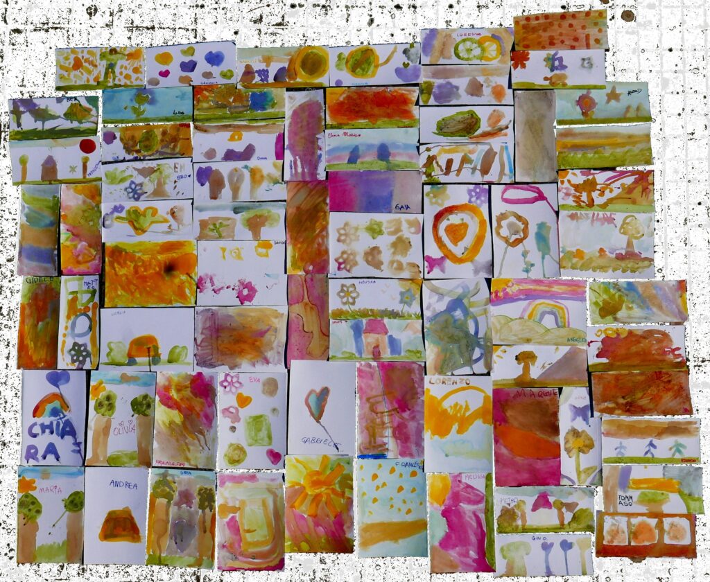 Il bellissimo “patchwork” con i disegni realizzati dalle bambine e dai bambini durante la Notte Europea delle Ricercatrici e dei Ricercatori 2025 (ARRM1, Montelibretti, Roma, 26 settembre 2025) presso l’attività laboratoriale di Giovanni D’Orazio (CNR-ISB) dal titolo “La scienza nascosta nei colori della Natura”